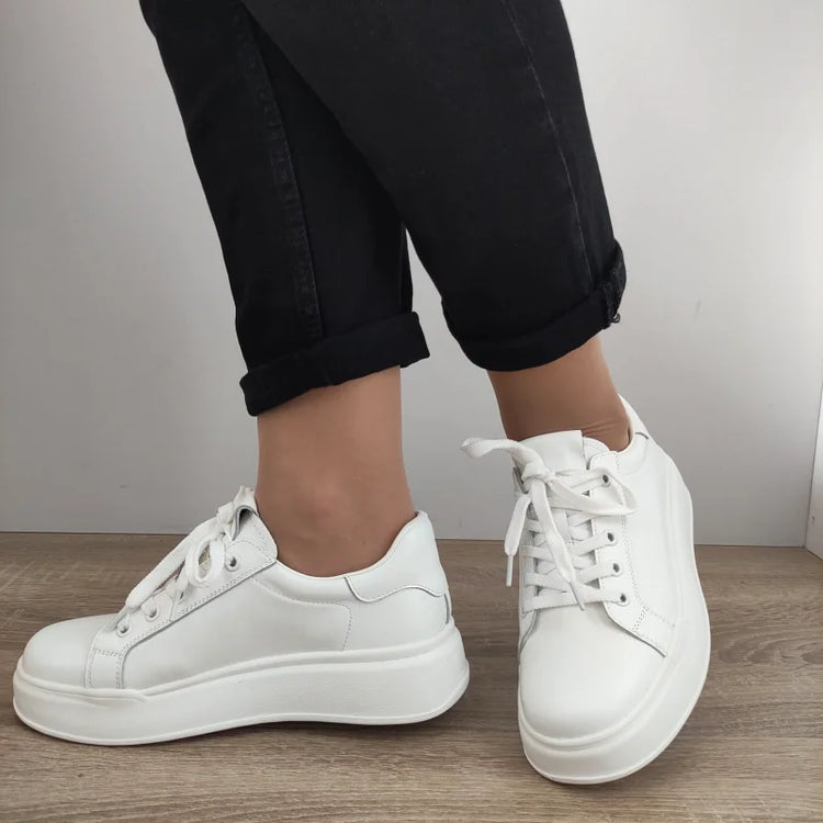Descriere: Pantofi casual pentru damă, marca Franco Gerardo, confecționați din piele naturală de culoare albă. Designul simplu și elegant îi face potriviți pentru orice ținută casual, oferind atât confort, cât și un aspect modern. Sistemul de închidere cu șireturi permite ajustarea perfectă pe picior, iar talpa de 3.5 cm oferă un plus de înălțime și stabilitate.