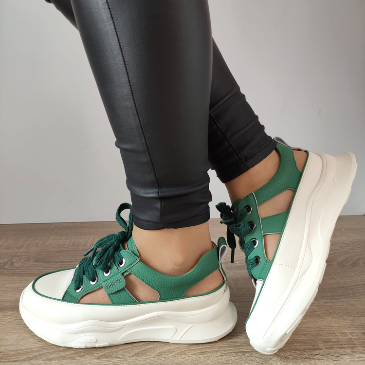 Sistemul de închidere cu șireturi asigură o potrivire perfectă și un aspect chic, completând astfel designul perforat care conferă aerisire piciorului. Cu o grosime a tălpii de 3,5 centimetri și o înălțime totală de 10 centimetri, acești pantofi adaugă o notă subtilă de înălțime și stil, în timp ce talpa fără toc oferă confort și stabilitate pe tot parcursul zilei.
