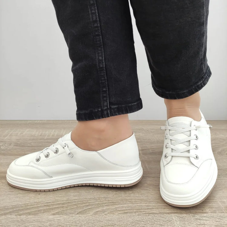 🔹 Detalii care atrag privirile! Sistemul de șireturi elastice metalizate adaugă o notă sofisticată și îți permit o încălțare rapidă, fără bătăi de cap. Culoarea albă imaculată scoate în evidență orice ținută, oferindu-ți un look modern și îngrijit. 🔹 Talpă perfect echilibrată! Concepută pentru un confort absolut, talpa ușoară și flexibilă de 2.8 cm îți oferă susținere excelentă, făcând din acești pantofi alegerea ideală pentru zilele active. 🔹 Versatilitate maximă! Fie că îi porți cu jeanși skinny, pantaloni lejeri sau chiar o rochie vaporoasă, acești pantofi vor adăuga un aer chic și relaxat stilului tău.