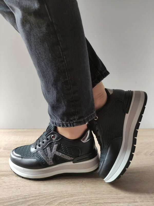 Pantofii casual de damă JOMIX ND10510-1 în nuanță negru cu accente metalice adaugă un plus de stil sport-chic ținutelor de zi cu zi. Construiți dintr-o combinație de textil respirabil și piele ecologică, acești pantofi oferă confort la mers, dar și un look modern și îndrăzneț. Logo-ul lateral în relief și detaliile strălucitoare conferă personalitate, iar talpa groasă de 5.5 cm adaugă înălțime fără a compromite stabilitatea.