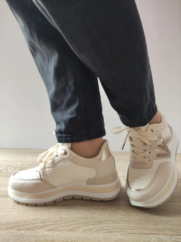 Descriere: Completează-ți ținutele de zi cu acești pantofi casual damă în nuanță bej cu detalii aurii subtile, perfecți pentru un look modern și feminin. Confecționați din material textil cu textură tip plasă și inserții laterale metalizate, acești pantofi ies în evidență prin designul lor sofisticat. Talpa înaltă de 6 cm adaugă înălțime și confort, fiind ideală pentru plimbări sau activități zilnice. Asortează-i cu jeanși, pantaloni largi sau rochii casual pentru un plus de stil în fiecare zi.