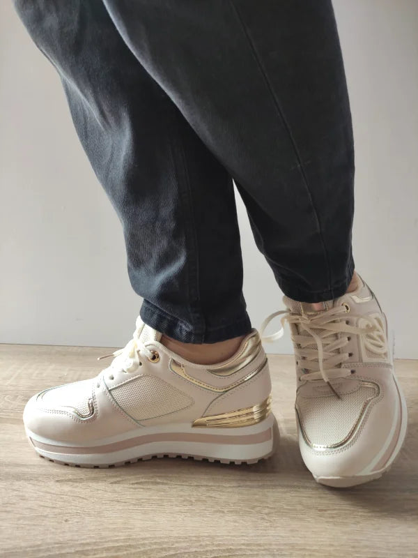 Descriere: Acești pantofi casual în nuanțe bej și auriu de la Jomix sunt combinația ideală între stil, confort și detalii prețioase. Designul modern integrează materiale textile și piele ecologică cu detalii lucioase, oferind un aspect sofisticat și ușor de asortat. Talpa de 5 cm completează perfect look-ul urban, iar șireturile clasice oferă o fixare sigură. Sunt alegerea perfectă pentru zilele în care vrei să te simți confortabil, dar să ieși totuși în evidență.