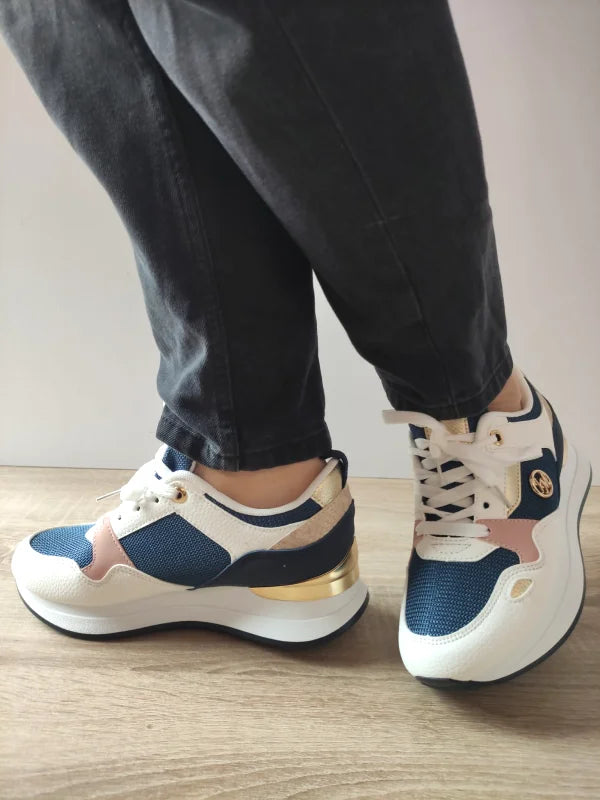 Descriere: Acești pantofi casual Jomix în nuanțe de alb și bleumarin, cu detalii roz pudrat și auriu metalizat, oferă o apariție de efect în orice zi. Talpa înaltă de 4.5 cm adaugă confort la fiecare pas, în timp ce combinația de material textil și piele ecologică asigură o potrivire ușoară și plăcută. Sunt perfecți pentru plimbări în oraș, ieșiri cu prietenii sau completarea unei ținute smart-casual.