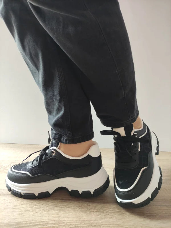 Descriere: Cu un design inspirat de moda urbană, acești pantofi sport Jomix negri atrag imediat atenția prin talpa supradimensionată și construcția solidă. Detaliile contrastante alb-negru accentuează linia pantofului și oferă un plus de stil oricărei ținute casual. Sunt comozi, rezistenți și ideali pentru femeile active care vor un look actual și confortabil.