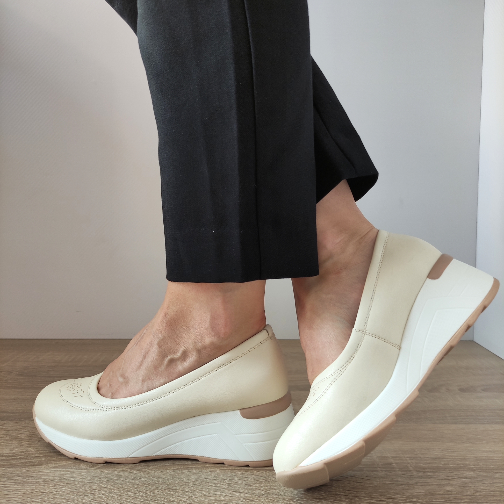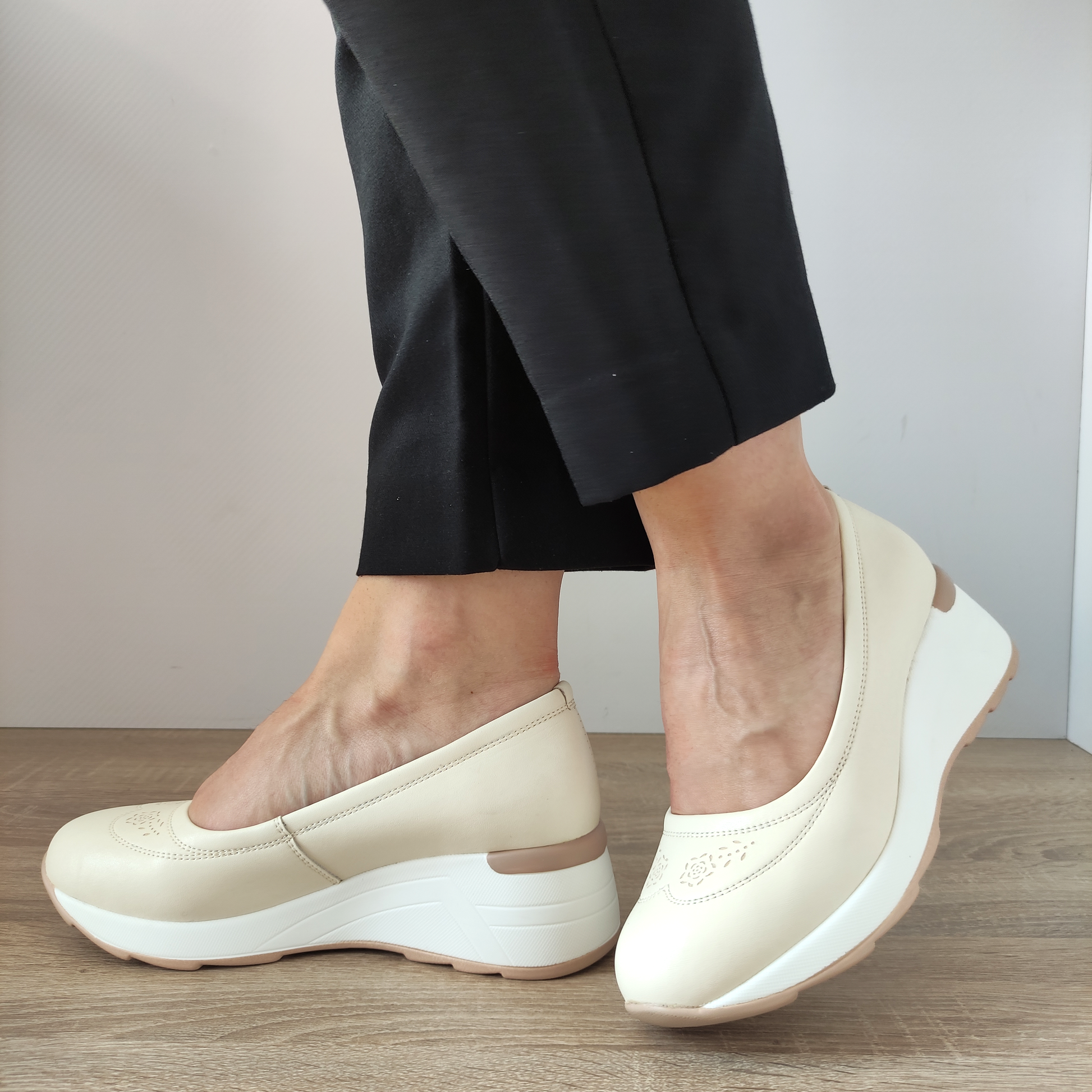 Material exterior: Piele naturală Tip închidere: Slip-on Tip: Pantofi casual Gen: Damă Culoare: Bej Grosimea tălpii (toc): 5 centimetri Înălțimea totală a pantofului: 11.5 centimetri Cod produs: KARISMA 40008B 52-N