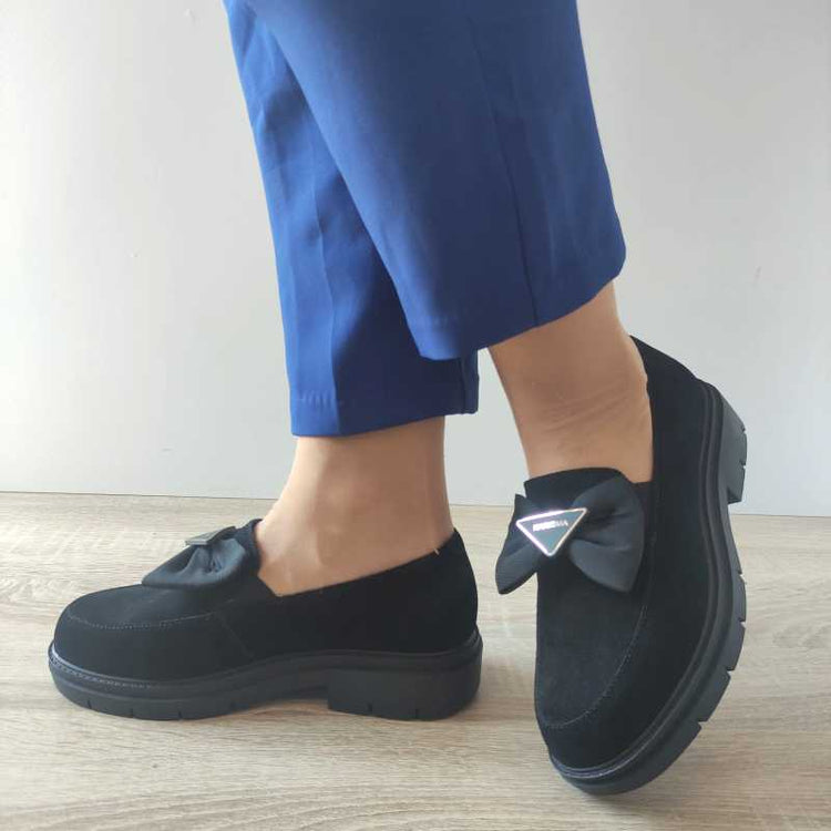 Pantofii casual pentru damă Karisma 50002B 01-I din piele naturală întoarsă aduc un plus de eleganță și rafinament oricărei ținute. Cu un design modern și detalii subtile, acești pantofi slip-on sunt ideali pentru un stil de viață activ, oferind atât confort cât și un aspect atrăgător. Talpa robustă și înălțimea totală de 9.5 centimetri adaugă un plus de înălțime și stabilitate, în timp ce finisajul din piele întoarsă neagră conferă o notă de rafinament.