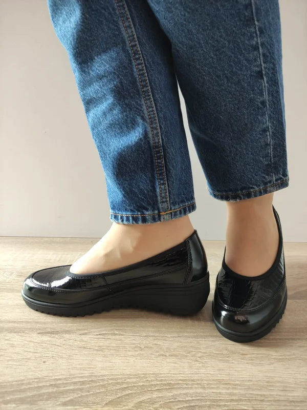 Caracteristici: Material exterior: Piele naturală lăcuită Culoare: Negru lac Înălțime totală: 11 cm Grosimea talpii (la spate): 4 cm Stil: Pantofi casual Tip închidere: Slip-on