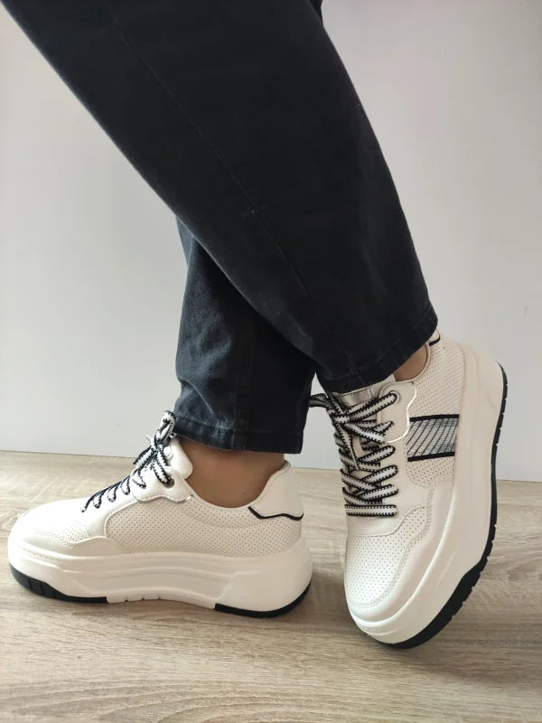 Acești pantofi sport de damă alb cu negru adaugă un vibe urban și modern oricărei ținute casual. Construiți din piele ecologică perforată, oferă un plus de respirabilitate în timpul purtării. Talpa groasă de 4.5 cm aduce nu doar confort, ci și un plus de înălțime subtil. Designul cu sireturi în contrast adaugă dinamism și stil, perfect pentru plimbări lungi sau activități de zi cu zi.