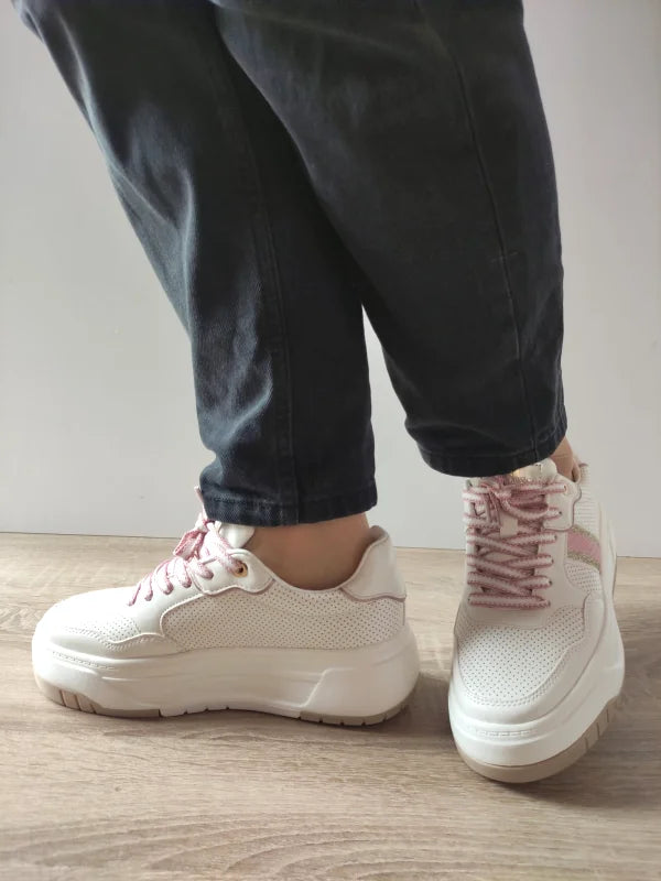 Caracteristici: Material exterior: Piele ecologică Culoare: Alb + roz Înălțime totală: 12 cm Grosimea talpii (la spate): 4.5 cm Stil: Pantofi casual Tip închidere: Sireturi