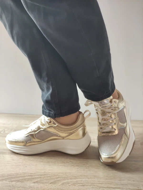 Descriere: Adu un plus de stil și energie fiecărei ținute cu acești pantofi casual damă aurii, ideali pentru zilele în care vrei să ieși în evidență. Materialele combinate – piele ecologică și textil tip plasă – oferă atât o estetică modernă, cât și o ventilație excelentă pentru picioare. Detaliile aurii reflectă lumina frumos, creând un efect vizual deosebit. Talpa înaltă adaugă câțiva centimetri și susține mersul în mod confortabil.