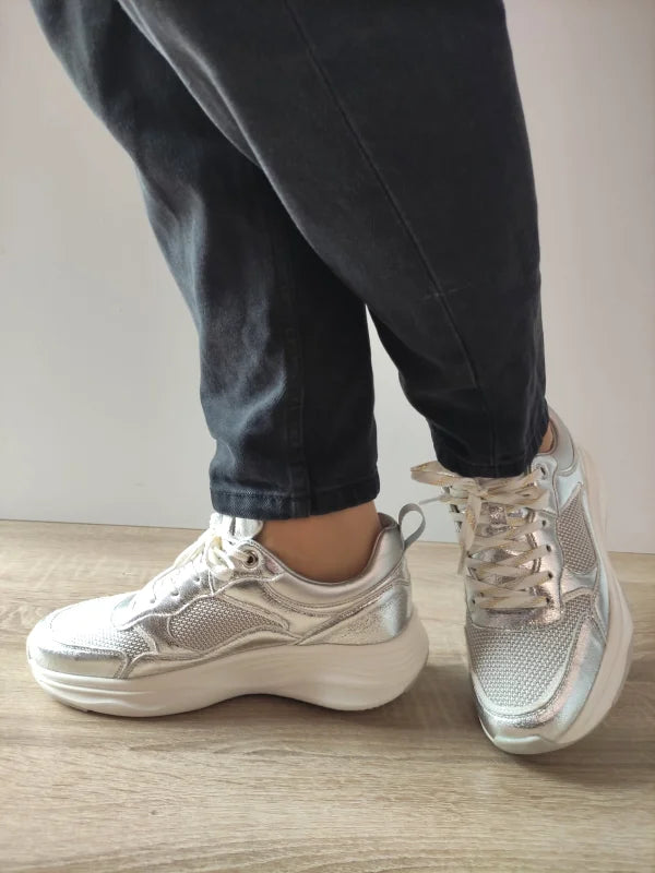 Descriere: Completează-ți ținutele moderne cu o pereche de pantofi casual argintii, perfecți pentru un stil urban îndrăzneț. Confecționați din piele ecologică și material textil tip plasă, acești pantofi oferă un echilibru ideal între aerisire și susținere. Designul futurist, accentele strălucitoare și talpa înaltă le transformă într-o alegere de efect, fie că îi porți în oraș sau într-o escapadă de weekend.