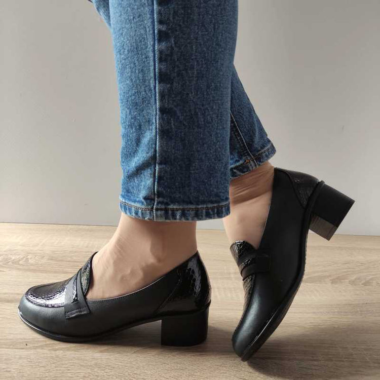 Pantofi casual pentru femei NICOLIS, combinație elegantă de piele naturală și piele lăcuită cu aspect croco. Acești pantofi oferă un stil unic și rafinat, fiind perfecți pentru ținutele casual de zi cu zi. Designul slip-on facilitează încălțarea rapidă și confortul, iar tocul de 4.7 cm oferă o susținere stabilă și un aspect sofisticat. Cu o înalțime totală de 11 cm, acești pantofi se potrivesc perfect atât pentru birou, cât și pentru ieșirile de seară.