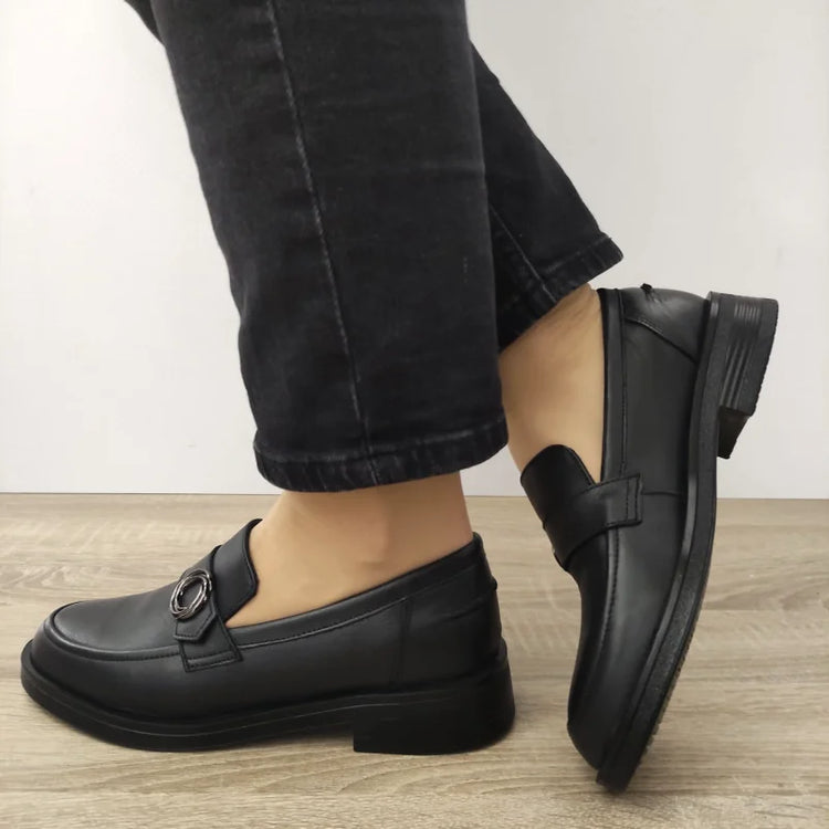🔹 Material premium – Construiți din piele naturală, oferă un aspect elegant și o durabilitate ridicată. 🔹 Slip-on practic – Design fără șireturi, pentru o încălțare rapidă și ușoară. 🔹 Înălțime totală de 9.5 cm – Oferă o potrivire confortabilă și un plus de susținere. 🔹 Talpă robustă de 3.5 cm – Asigură stabilitate și confort pe tot parcursul zilei. 🔹 Accesoriu decorativ metalic – Adaugă un detaliu sofisticat și un plus de eleganță. 🔹 Culoare neagră versatilă – Ușor de asortat cu diverse ținute formale și casual.