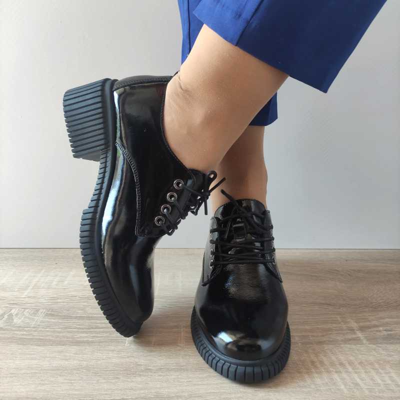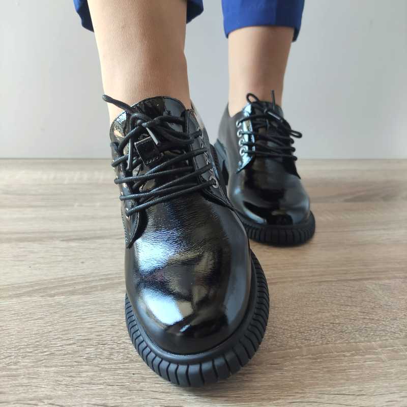 Acești pantofi casual pentru femei marca PASS aduc un plus de eleganță oricărei ținute prin designul modern și aspectul lucios. Realizați din piele naturală în nuanța de negru lac, aceștia oferă un look rafinat, potrivit atât pentru ocazii speciale, cât și pentru purtarea zilnică. Cu un toc de 5 cm și o înălțime totală de 10,5 cm, acești pantofi asigură o postură elegantă și confort la fiecare pas. Sistemul de închidere cu șireturi permite o ajustare perfectă pe picior.