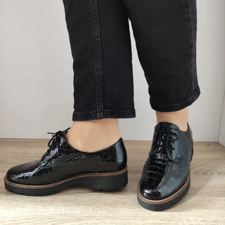 Descriere: Pantofi casual de damă, confecționați din piele naturală lăcuită cu model croco negru, perfect pentru un stil modern și elegant. Modelul cu șireturi oferă o fixare fermă, iar talpa de 3.8 cm, robustă și profilată, asigură aderență și confort pe tot parcursul zilei. Ideali pentru un look sofisticat și versatil.