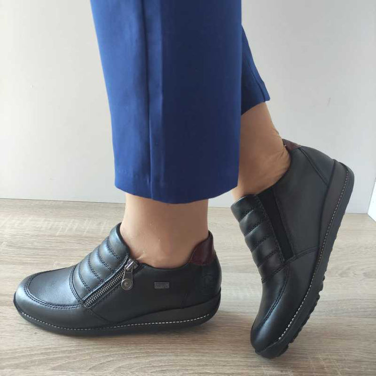 Pantofii casual pentru damă de la Rieker combină stilul modern cu confortul oferit de materiale de înaltă calitate. Realizați din piele naturală și piele ecologică, acești pantofi asigură o purtare plăcută pe parcursul întregii zile. Sistemul de închidere cu fermoar și elastic facilitează încălțarea rapidă și oferă o fixare sigură. Talpa joasă contribuie la stabilitate, fiind potrivită pentru activitățile zilnice.