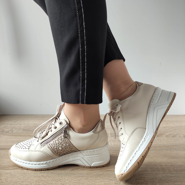 Pantofii casual RIEKER N4344-60 pentru femei sunt o alegere ideală pentru confort și stil. Confecționați din piele naturală de înaltă calitate, acești pantofi oferă durabilitate și rafinament. Închiderea cu șireturi și fermoar adaugă o notă de practicitate și siguranță. Cu o talpă cu o grosime de 4,5 centimetri și o înălțime totală de 11 centimetri, acești pantofi oferă confort pe tot parcursul zilei, iar absența tocului îi face potriviți pentru o varietate de activități. Cod produs: N4344-60.