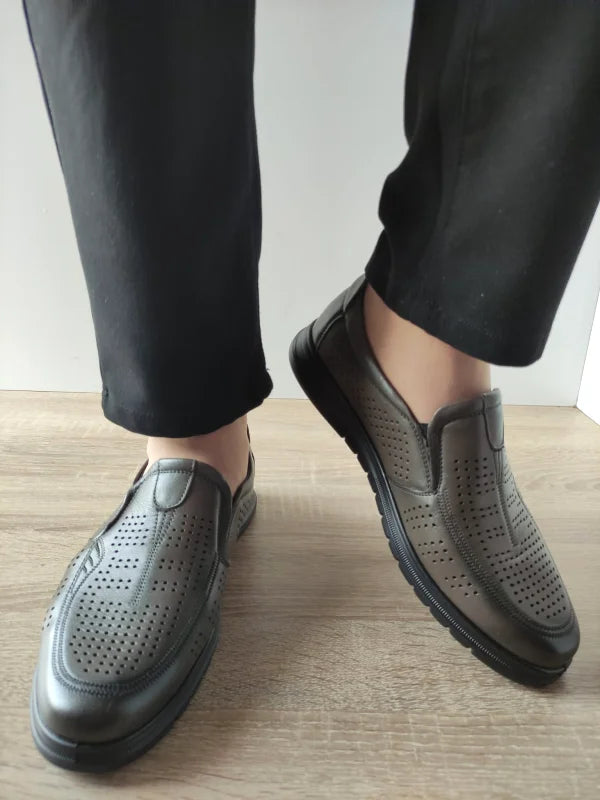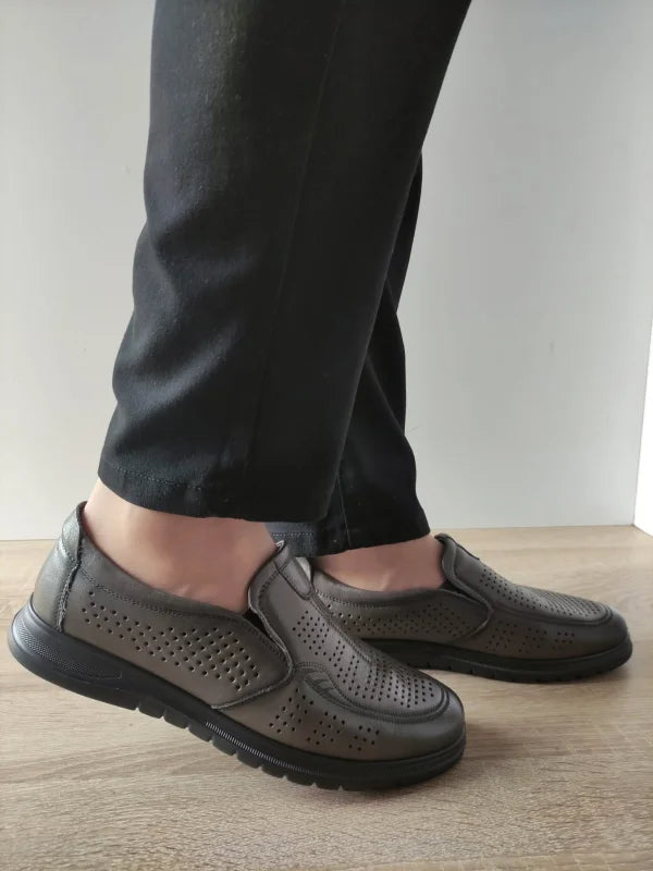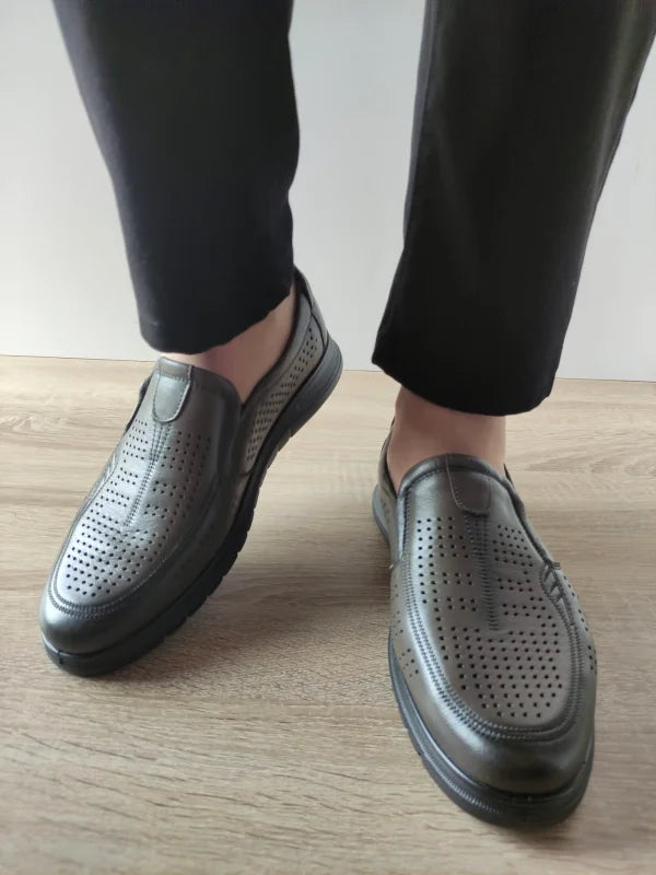 Alege o combinație reușită între stil, confort și funcționalitate cu acești pantofi casual perforați gri din piele naturală. Designul slip-on cu benzi elastice laterale permite încălțarea ușoară și rapidă, în timp ce perforațiile atent plasate asigură o aerisire excelentă chiar și în zilele toride. Talpa flexibilă și confortabilă oferă aderență bună și un mers stabil.