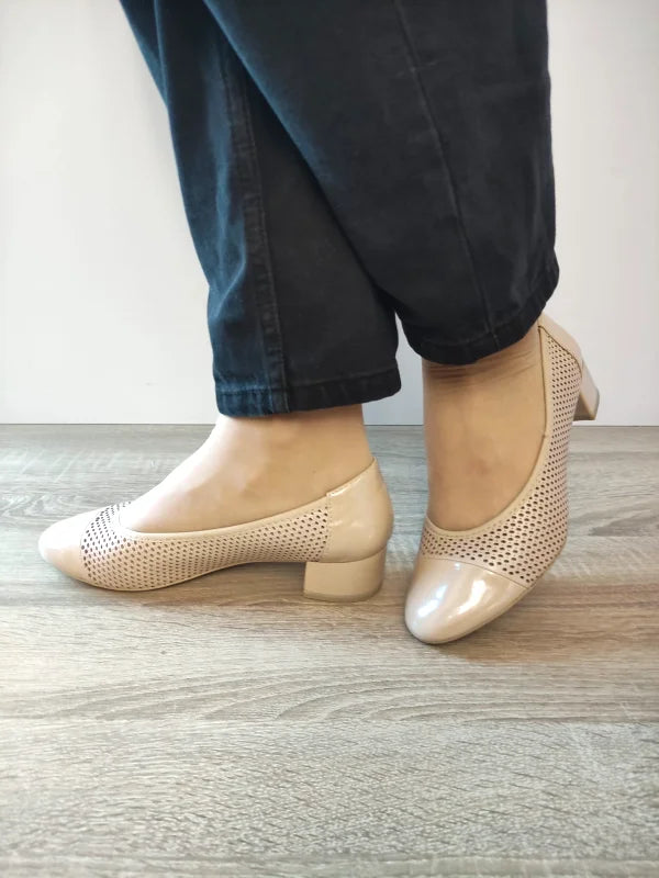 Caracteristici: Material: Piele naturală + piele ecologică Culoare: Bej + bej lac Înălțime totală: 9.5 cm Înălțimea tocului: 3.5 cm Tip: Pantofi eleganți Tip închidere: Slip-on Lățime: G (confort lărgit) Tehnologie: Antishock
