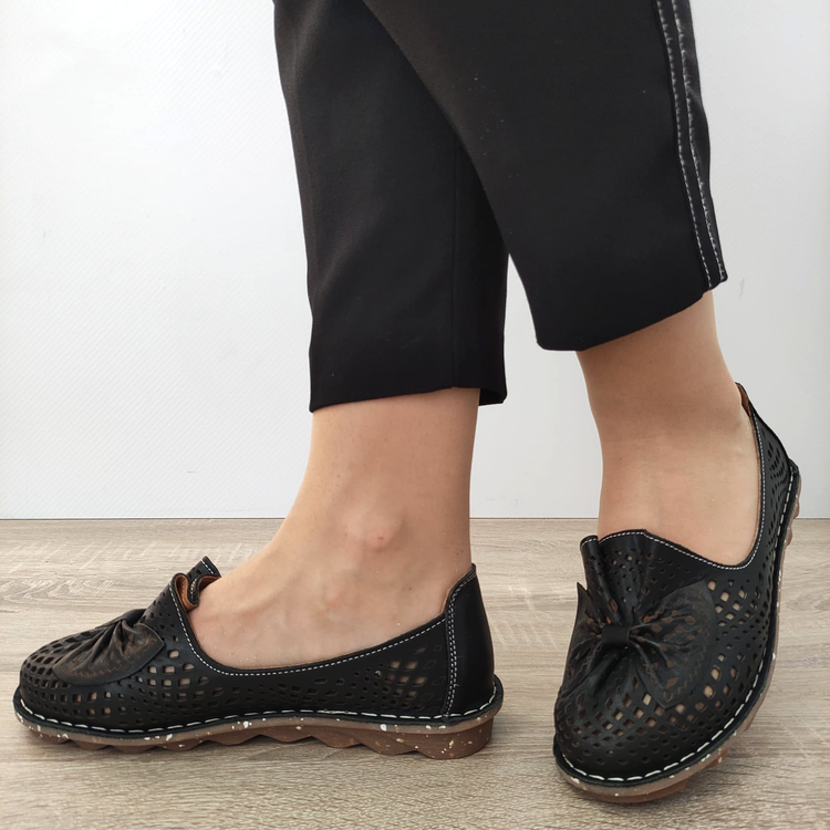 Acești pantofi casual perforați pentru femei sunt confecționați din piele naturală, oferind un aspect elegant și o durabilitate ridicată. Închiderea tip slip-on permite încălțarea și descălțarea rapidă, fără a fi nevoie de șireturi sau alte elemente de prindere. Designul perforat al pantofilor adaugă un element de stil și permite piciorului să respire în zilele călduroase de vară. Pantofii au o grosime a tălpii de 2 centimetri și o înălțime totală de 9 centimetri, asigurând confortul necesar pentru purtarea lor pe durata întregii zile.