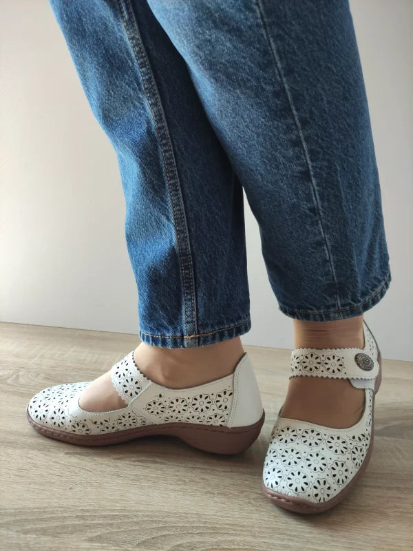 Descoperă confortul absolut și designul feminin al pantofilor Maria Conti 739894, perfecți pentru zilele călduroase. Realizați din piele naturală albă, acești pantofi impresionează prin modelul perforat floral care lasă piciorul să respire, oferind un aer elegant și lejer în același timp. Închiderea cu scai (velcro) permite o fixare rapidă și ușoară, iar talpa comodă, cu o grosime de 3 cm la spate, asigură stabilitate și confort pe tot parcursul zilei.