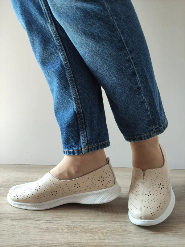 Pantofii care îți dau libertate la fiecare pas! Confecționați din piele naturală perforată, acești pantofi slip-on Maria Conti sunt perfecți pentru mers mult sau purtare zilnică. Talpa ușoară și flexibilă, împreună cu designul aerisit cu perforații florale, asigură confort chiar și în cele mai călduroase zile. Culoarea bej completează perfect orice ținută casual, oferind un look curat, feminin și relaxat.