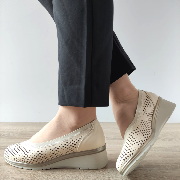 Acești pantofi sunt confecționați din piele naturală, garantând calitate și confort. Închiderea tip slip-on, cu elastic, facilitează încălțarea rapidă și comodă. Designul perforat îi face potriviți pentru zilele călduroase, asigurând o bună aerisire a piciorului. Grosimea tălpii este de 4,5 centimetri, iar înălțimea totală a pantofului este de 11 centimetri, oferind o combinație echilibrată între stil și confort. Absența tocului îi face ideali pentru utilizarea zilnică, oferind libertate de mișcare și confort pe tot parcursul zilei. Codul produsului pentru acești pantofi este PITILLOS 5741.
