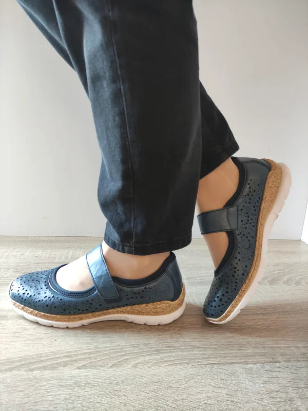 Cu un design inspirat din balerinii sport și confortul bine-cunoscut al brandului Rieker, acești pantofi casual albastru închis sunt perfecți pentru plimbări, cumpărături sau birou. Partea superioară din piele ecologică perforată asigură o bună ventilație, în timp ce talpa ușoară din spumă oferă flexibilitate și susținere. Banda velcro (cu scai) face încălțarea rapidă și sigură.