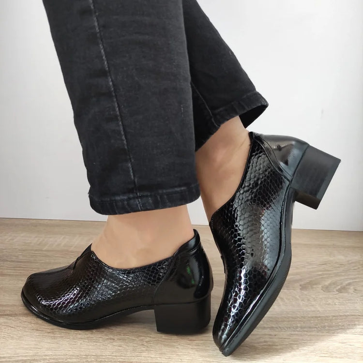 Descriere: Pantofi eleganți de damă cu model negru croco, din piele naturală lăcuită, cu un design modern și toc gros de 4 cm. Perfect pentru un look rafinat și sofisticat, acești pantofi adaugă un strop de eleganță la orice ținută formală.