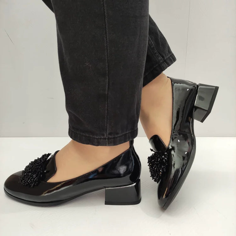 Descriere: Un model sofisticat și îndrăzneț, acești pantofi negru lac de la Epica ies în evidență prin designul lucios și aplicația decorativă cu perle și mărgele, care adaugă un accent de eleganță aparte. Confecționați din piele naturală lăcuită, oferă un look glam perfect pentru evenimente speciale sau ținute office cu personalitate. Tocul mic și stabil adaugă confort, iar sistemul slip-on permite încălțarea rapidă și ușoară.