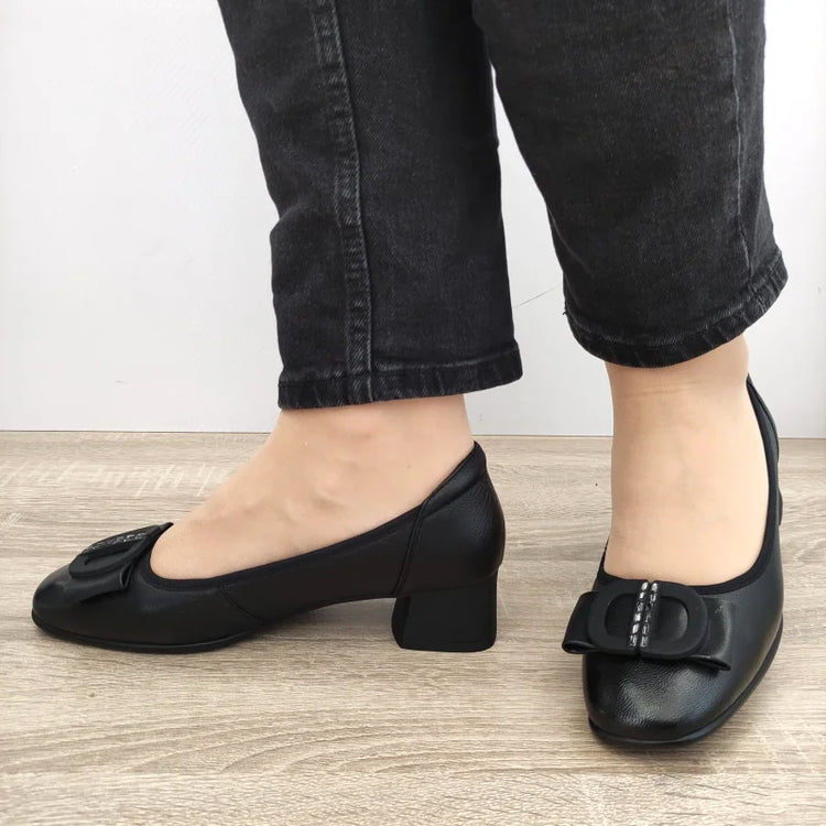 Confecționați din piele naturală premium, acești pantofi oferă o senzație plăcută la purtare și durabilitate îndelungată. Designul cu vârf pătrat și aplicația decorativă tip fundă cu detalii metalice adaugă un plus de eleganță, transformându-i într-un accesoriu esențial pentru orice garderobă sofisticată.