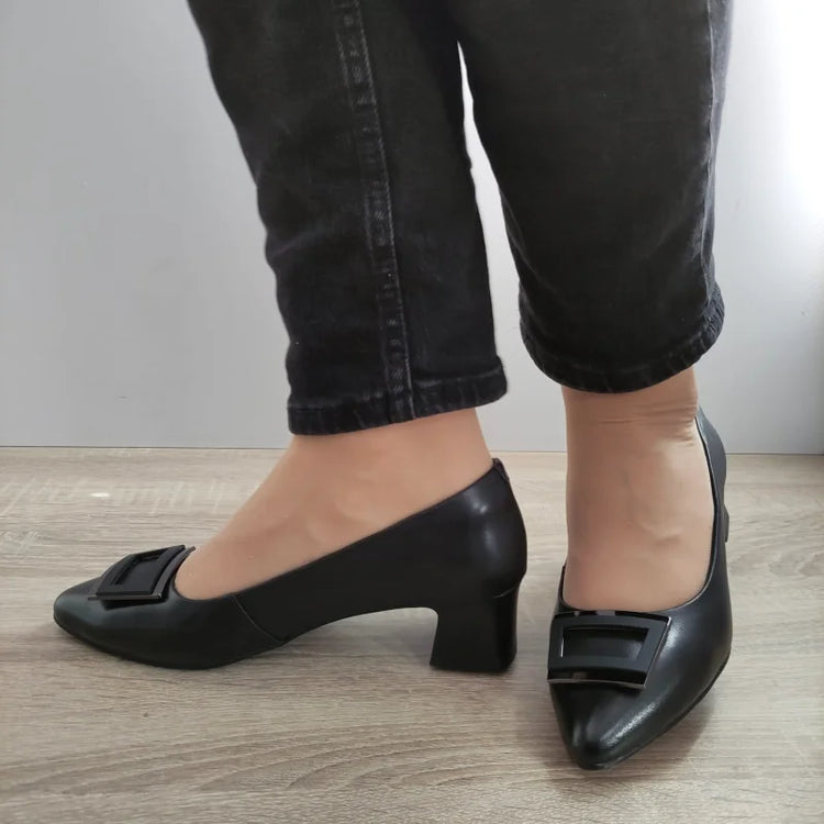 Modelul se remarcă prin vârful ascuțit și detaliul decorativ cu element metalic contrastant, care adaugă un aer modern și stilat. Tocul stabil de 4.2 cm oferă susținere optimă, permițând purtarea pe tot parcursul zilei fără disconfort.