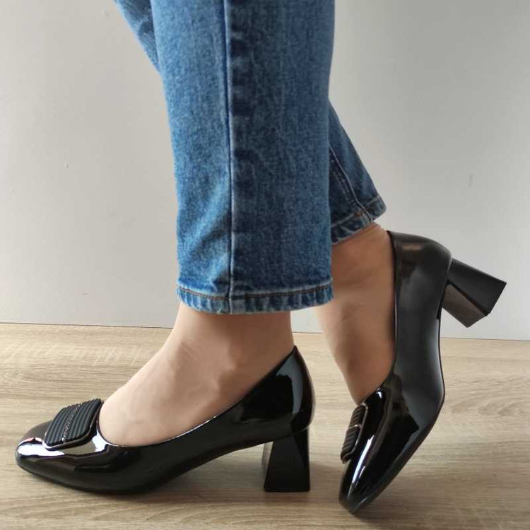 Pantofi eleganți pentru damă de la Formazione, model negru lăcuit, confecționați din piele naturală. Acești pantofi adaugă o notă de rafinament oricărei ținute elegante, combinația de lac și designul clasic conferind un aspect sofisticat.