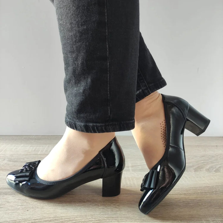 Pantofi eleganți de damă KARISMA, confecționați din piele naturală lăcuită în nuanța negru lucios. Accesorizarea cu fundiță adaugă un detaliu rafinat, oferind un plus de eleganță și stil. Modelul slip-on cu toc mediu este ideal pentru evenimente sau ținute office, combinând confortul cu un aspect sofisticat.