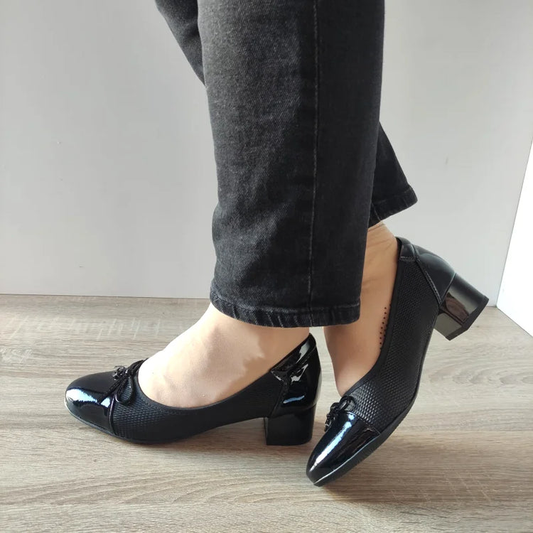 Pantofi eleganți de damă KARISMA, combinație sofisticată de piele naturală lăcuită și textil texturat. Designul clasic este completat de detaliile discrete și de fundița elegantă din față. Tocul mediu și construcția slip-on oferă un confort sporit și o purtare ușoară.