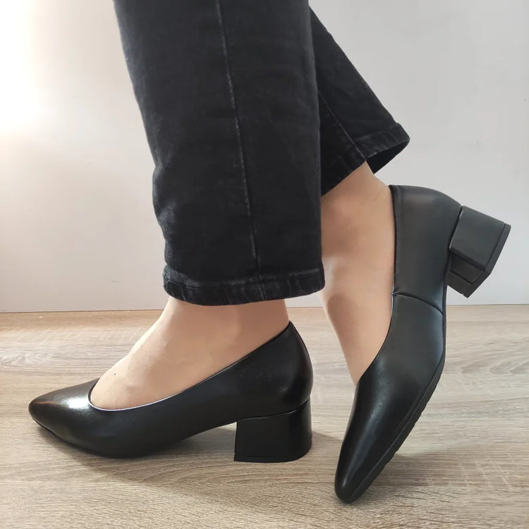 Descriere: Pantofi eleganți de damă, în nuanță clasică de negru, confecționați din piele naturală de calitate superioară. Designul simplu și rafinat este accentuat de tocul gros de 4 cm, oferind stabilitate și confort pentru întreaga zi. Acești pantofi slip-on sunt ideali pentru ținutele elegante de birou sau evenimentele formale.