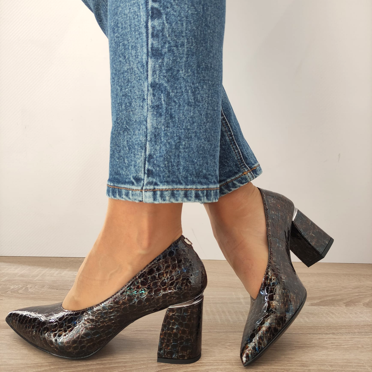 Acești pantofi pentru damă, cu codul produs SALA 20240 1743, emană o eleganță atemporală și sunt potriviți pentru orice ocazie specială. Fabricați din piele naturală lăcuită cu un model care imită pielea de reptilă, acești pantofi sunt nu numai stilati, dar și de calitate superioară.