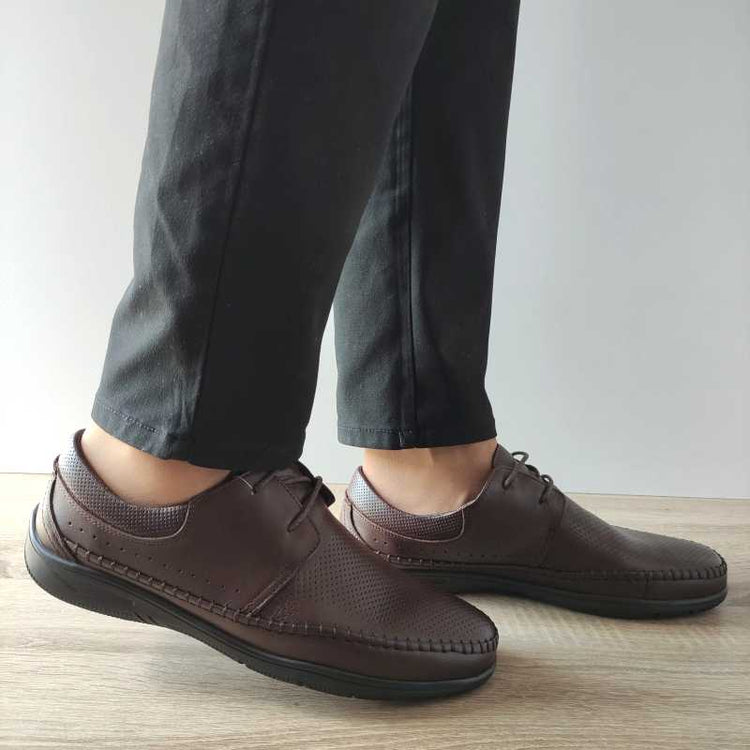 Pantofii perforați Otter pentru bărbați, modelul OTA 11 C4-N, în nuanțe de maro închis, sunt perfecți pentru sezonul cald datorită perforațiilor care asigură o bună ventilație. Realizați din piele naturală, aceștia oferă un confort deosebit și un aspect casual, potrivit pentru orice ocazie. Talpa de 2 cm asigură flexibilitate și confort la purtare, iar sistemul de închidere cu șireturi permite o fixare personalizată.