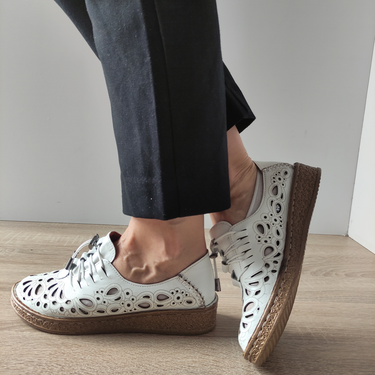 Îți prezentăm pantofii perforați casual pentru damă de la Dogati, modelul 7154-1. Acești pantofi sunt confecționați din piele naturală, oferind un aspect elegant și durabilitate. Designul perforat permite o ventilație excelentă, perfectă pentru zilele călduroase de vară. Sistemul de închidere slip-on cu elastic asigură o fixare rapidă și confortabilă. Talpa de 3 centimetri și înălțimea totală a pantofului de 9 centimetri oferă stabilitate și confort pe durata întregii zile.