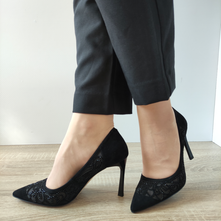 Completează-ți ținuta cu eleganță și stil cu acești pantofi perforați pentru damă de la Epica. Modelul 340068 01-I în culoarea negru velur este realizat din piele naturală întoarsă, oferind un aspect sofisticat și o durabilitate excelentă. Designul perforat și detaliile delicate cu accente strălucitoare adaugă un plus de rafinament și feminitate, perfect pentru ocaziile speciale. Tocul subțire înalt completează aspectul elegant, conferind o siluetă înaltă și grațioasă.
