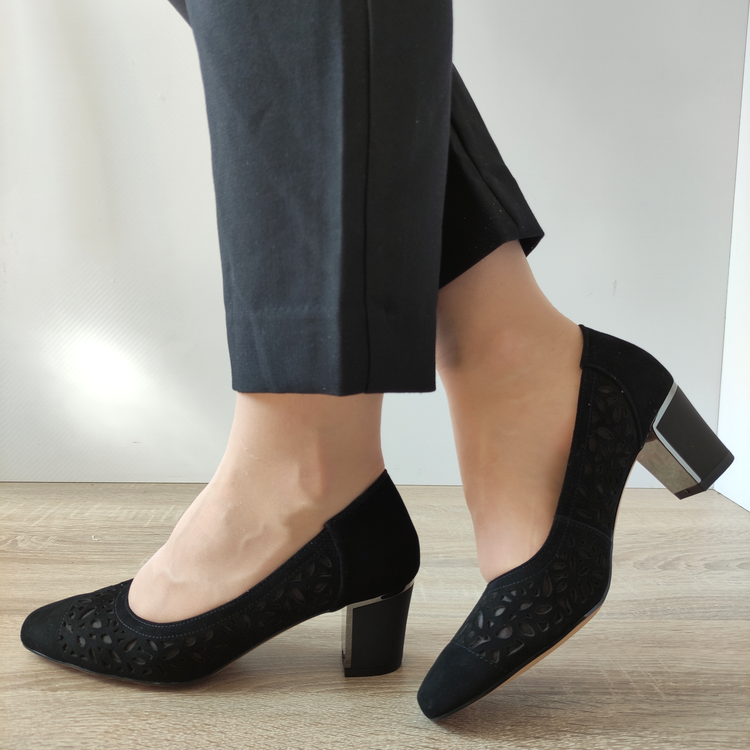 Completează-ți garderoba cu eleganță și confort cu acești pantofi perforați pentru damă de la Epica. Modelul 40070D 01-I, de culoare negru velur, este realizat din piele naturală întoarsă, oferind un aspect sofisticat și o durabilitate excelentă. Designul perforat adaugă un plus de stil și permite piciorului să respire, fiind ideal pentru zilele călduroase. Detaliile perforate, alături de finisajul din velur negru, conferă pantofilor un look modern și rafinat, perfect pentru orice ținută elegantă.