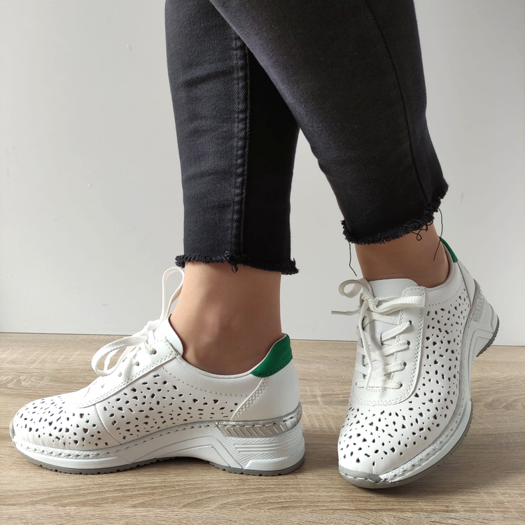 Pantofii perforați casual pentru damă RIEKER N43A1-80 oferă un design elegant și funcțional pentru femeile care caută confort și stil în același timp. Acești pantofi combină pielea naturală și pielea ecologică, asigurând un aspect sofisticat și durabilitate.