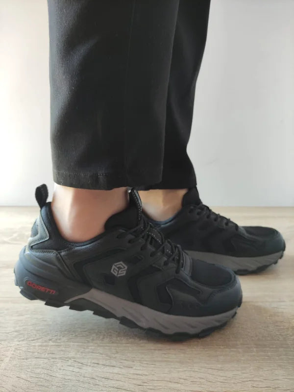 Robuști, practici, perfecți pentru zi de zi. Pantofii sport Goretti B100-CL27688 în nuanță negru cu talpă gri închis sunt o alegere ideală pentru bărbații activi. Construiți din material textil rezistent, oferă susținere și confort în orice activitate. Talpa solidă asigură aderență bună, fiind potriviți pentru mers, plimbări sau activități lejere în aer liber.