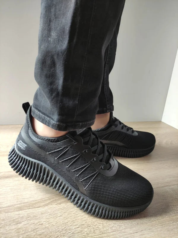 Pantofii sport pentru bărbați Skechers 118171 BBK în nuanța negru combină un design modern cu funcționalitate maximă, fiind perfecți pentru activități zilnice, mers îndelungat sau ținute casual-sport. Construiți din material textil respirabil, aceștia asigură o bună ventilație și confort pe durata purtării. Sistemul slip-on cu șireturi permite încălțarea rapidă, menținând totodată fixarea optimă pe picior. Talpa ușoară cu grosimea de 3,8 cm oferă aderență și amortizare eficientă, iar înălțimea totală a pantofului de 11,5 cm asigură susținere și protecție.