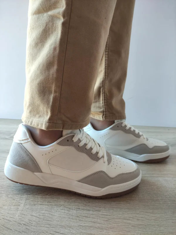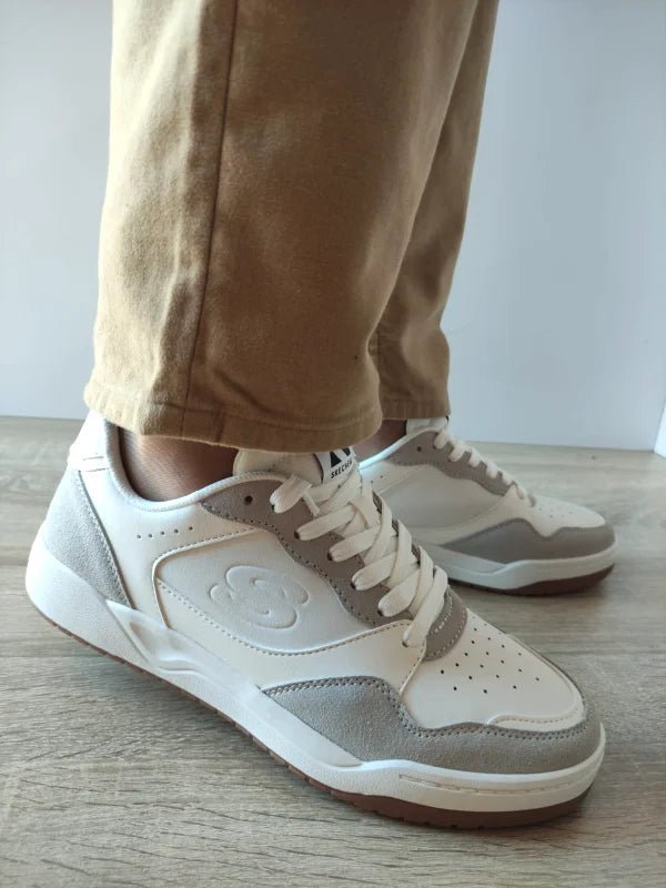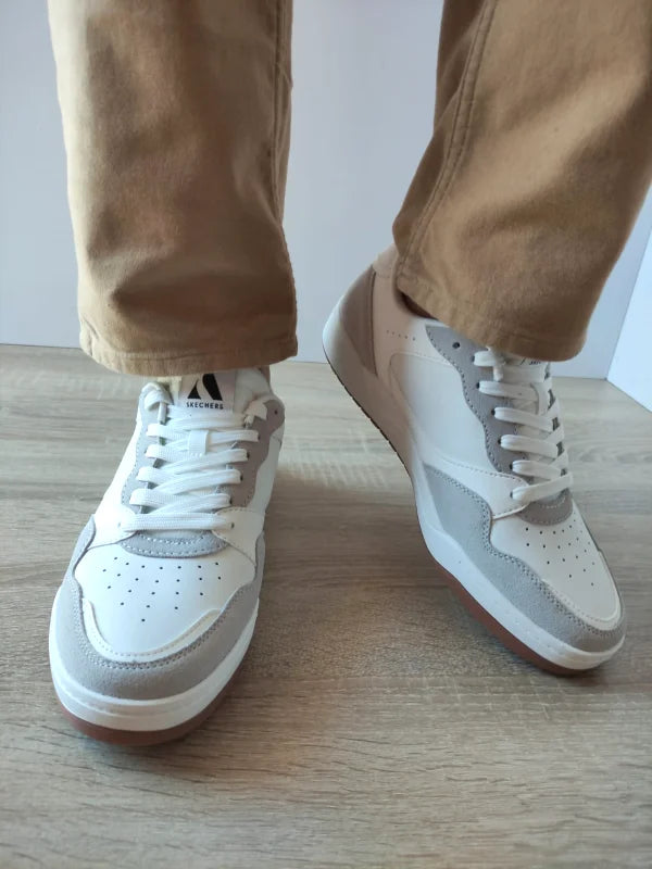 Pantofi sport realizați din piele naturală combinată cu piele ecologică, prevăzuți cu branț Air-Cooled Memory Foam pentru o ventilație optimă și confort superior. Talpa ușoară oferă stabilitate și aderență excelentă, iar designul curat, în nuanțe de alb cu accente gri, adaugă un aspect elegant și modern.