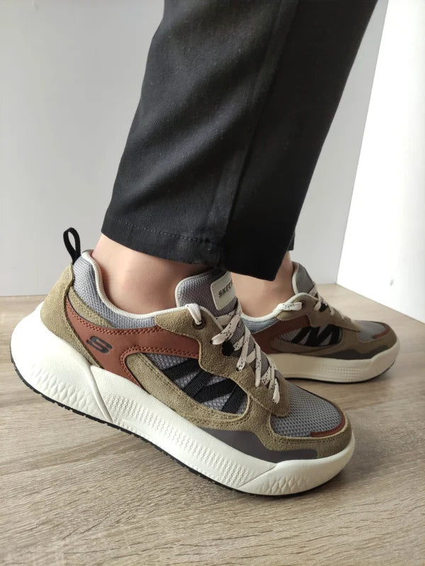 Pantofii Sport Bărbați Skechers 211007 TPMT în nuanțele Taupe și Gri combină stilul modern cu funcționalitatea. Construiți dintr-un mix de piele naturală și material textil respirabil, acești pantofi oferă confort și rezistență, fiind perfecți pentru un stil de viață activ. Talpa robustă de 4 cm oferă amortizare optimă, iar branțul cu tehnologie Air-Cooled Memory Foam asigură aerisire și adaptare perfectă la forma piciorului. Sistemul de închidere cu șireturi permite ajustare precisă, iar detaliile de design sportiv-urban îi fac potriviți pentru plimbări lungi, oraș sau escapade relaxante.