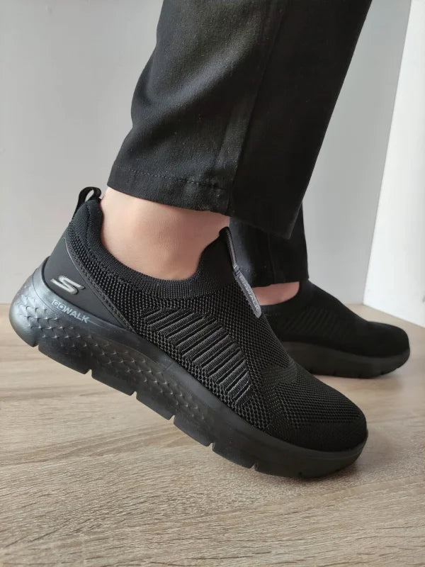 Material: Textil Culoare: Negru Înălțime totală a pantofului: 10.5 centimetri Grosimea tălpii: 4 cm Stil: Pantofi sport Tip închidere: Slip-on Detalii: Talpă Ultra Go ușoară și amortizantă, material textil elastic pentru fixare confortabilă, design slip-on pentru încălțare rapidă, ideal pentru mers susținut și confort zilnic