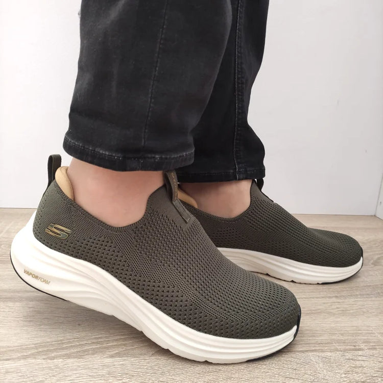 🌿 Skechers Slip-On 232629 – confort pur, stil fără efort. Acești pantofi sport pentru bărbați în nuanță olive, cu talpă VAPORFoam ultra ușoară și design slip-on, sunt perfecți pentru zilele active în care vrei să te simți relaxat, dar să arăți impecabil.