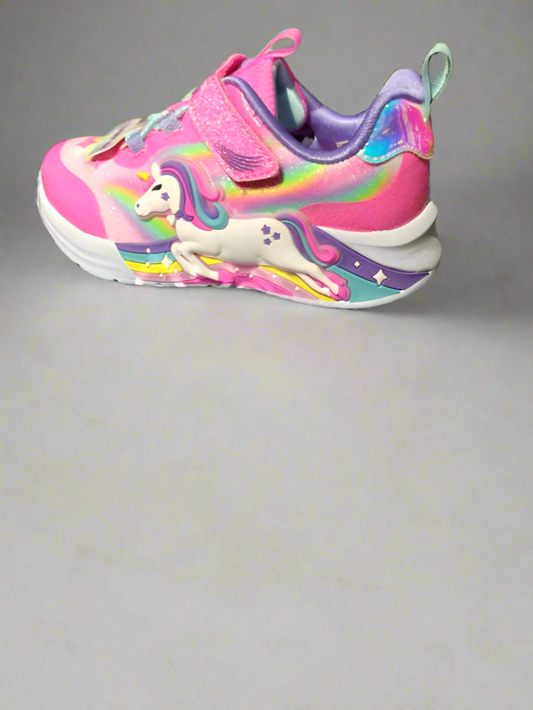 Descriere: Pantofii sport pentru copii SKECHERS Unicorn Chaser aduc magie la fiecare pas! Modelul în nuanțe vesele de roz combină un design spectaculos cu un unicorn 3D și detalii sclipitoare, perfecte pentru fetițele care iubesc poveștile și culoarea. Talpa cu lumini LED oferă un efect vizual deosebit la mers, iar închiderea cu scai asigură o încălțare ușoară și rapidă. O alegere ideală pentru primăvară și pentru zilele pline de joacă!