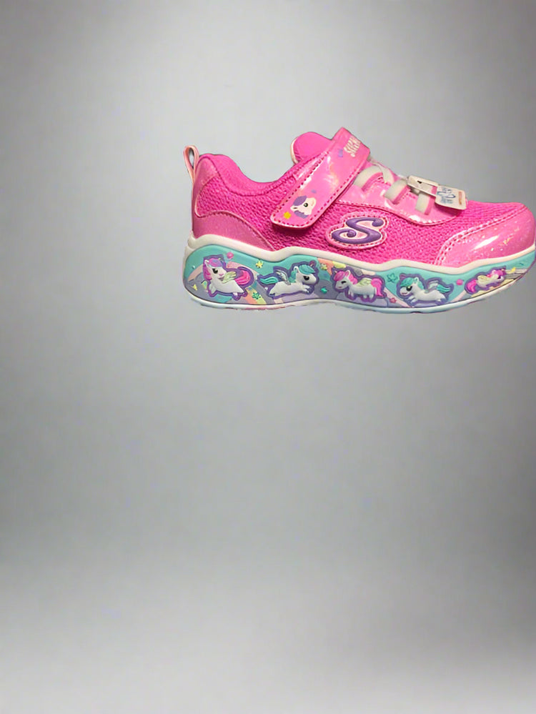 Descriere: Cucerește imaginația celor mici cu acești pantofi sport Skechers roz cu unicorn! Un model adorabil, perfect pentru fetițele pline de energie și visătoare. Designul în nuanțe de fucsia cu detalii colorate cu unicorni pe talpă transformă fiecare pas într-o aventură magică. Se încalță ușor datorită sistemului cu scai (velcro) și oferă confort optim datorită interiorului textil moale și respirabil. Talpa flexibilă și lejeră asigură mișcare naturală și susținere pe tot parcursul zilei.